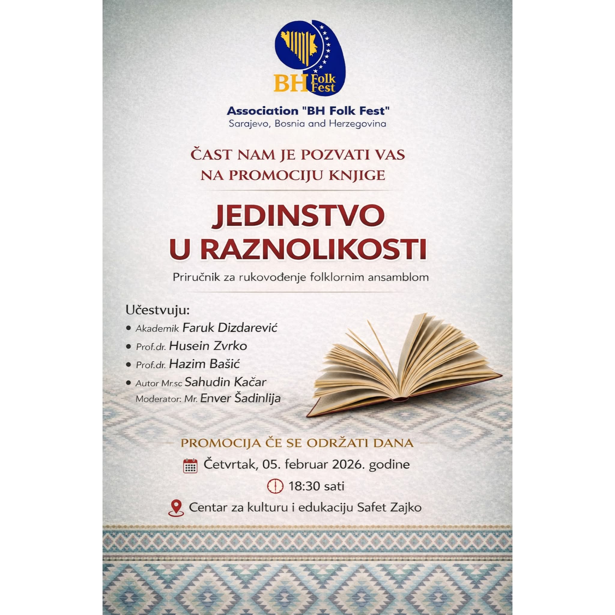 U Centru za kulturu i edukaciju „Safet Zajko“, u Općini Novi Grad Sarajevo , u četvrtka  05. februara 2026. godine u 18:30 sati održat će se promocija knjige „Jedinstvo u razolikosti – priručnik za rukovođenje folklornim ansamblom“, autora Sahudina Kačara u izdanju Udruženja „Folk Fest“.